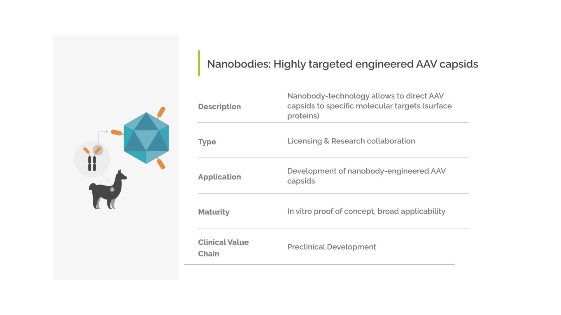 Highly specific nanobodies are a novel rational design strategy that allow direct targeting of a surface protein of interest. This technology can be applied separately or in combination with directed evolution of AAV capsids to further enhance cell or tissue tropism and minimize off-target effects.